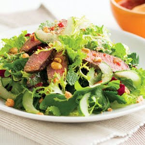 A refreshing blend of orange and basil brings out the natural flavors of grilled beef. (For a vegetarian option, replace beef with tempeh. Marinate the tempeh in one-fourth of this dressing, then grill.) This salad would also be great with grilled chicken breast.