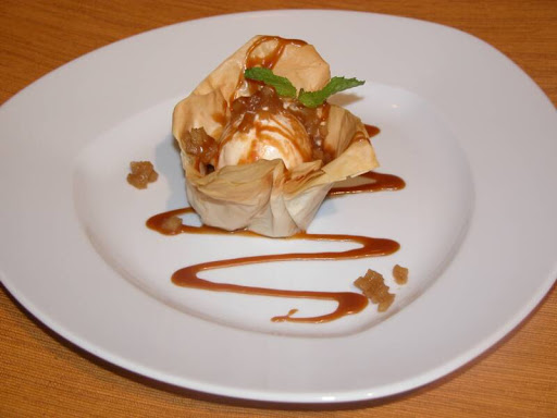 Llenar la cesta con una bola de helado, un poco de crema batida y las frutas Espolvoree algunas virutas de chocolate y presentar adornada con una gota de chocolate en el fondo del plato.