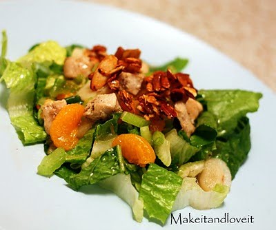 Heat almonds and sugar at medium heat in a small pan. Stir continuously until the sugar has heated through and coated the almonds with a nice caramelized coating. (Don't worry if the sugar gets all clumpy and seems to not be working. Just keep stirring.....it will melt.) Then spread over foil and let cool completely. Chop up all of the remaining salad ingredients and mix together in bowl. In a cruet, mix in all the ingredients for the dressing. Shake until completely blended. The dressing isn't soluble so you'll have to shake again right before pouring over your salad.
