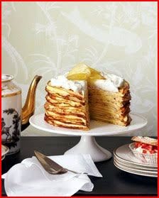 4.Place 1 crepe on a flat serving dish. Spread about 1/4 cup lemon curd mousse onto crepe. Top with 1 crepe. Continue layering crepes and mousse. (Use 15 crepes, ending with a crepe on top.) Refrigerate until firm, about 1 hour.