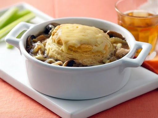 3. Spoon chicken into ramekins (about 1/2 cup each). Spoon onion mixture over chicken (about 2/3 cup each). Sprinkle with pepper. Separate dough into 8 biscuits. Place 1 biscuit in each ramekin.