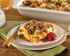 In a skillet, cook the sausage until browned. Drain well. In a large mixing bowl, combine the cheese, chicken soup, sour cream, French onion dip, chopped onion, bell peppers, salt and pepper. Fold in thawed hash brown potatoes. Mix well. Spread ½ of the hash brown mixture over bottom of a 9 X 13-inch greased baking dish. Spread ½ of the browned sausage over hash browns. Repeat layering second ½ of hash brown mixture. Top with remaining sausage. Bake at 350°F for about one hour or until casserole is golden brown.