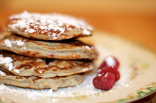 Beat egg, add milk and oil. Sift all purpose flour, sugar, baking powder, soda and salt; add along with whole wheat flour and oats to liquid. Mix just until mixed. Very good with a mashed ripe banana and chopped pecans or walnuts.