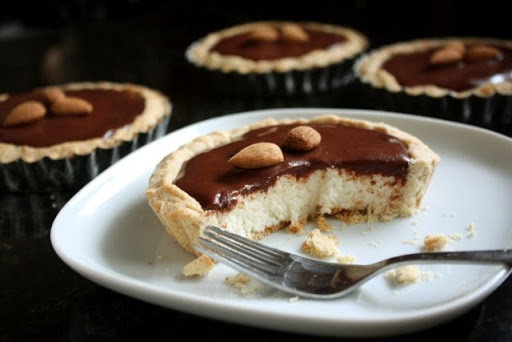 To make the chocolate glaze, place the chocolate in a medium heatproof bowl. Put the heavy cream in a small saucepan over medium heat. Bring just to a boil and pour over the chocolate. Whisk until smooth. Let the mixture set for about 10 minutes, then pour over the filled tart shells. Top each tart with toasted almonds and refrigerate until the glaze sets, about 10 minutes.