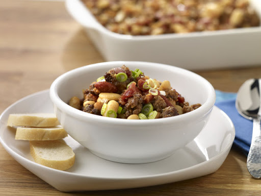 3. In 2-quart casserole, combine beef mixture and remaining ingredients except green onions; mix well. Bake 45 minutes or until bubbly. Sprinkle with green onions to serve.