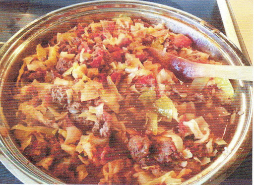 Add the chopped cabbage, tomatoes, tomato sauce, pepper, and salt. Bring to a boil. Cover and simmer for 20 to 30 minutes, or until cabbage is tender.