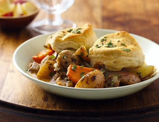 3. Separate dough into 10 biscuits; arrange on top of hot pork mixture. Bake uncovered 14 to 18 minutes longer or until biscuits are golden brown. Sprinkle with cilantro before serving.