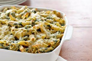 DRAIN pasta. Add to spinach mixture with mozzarella; mix lightly. Spoon into 8- or 9-inch square baking dish; top with Parmesan.
