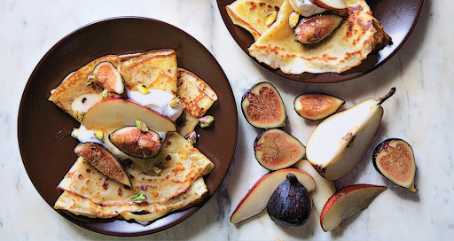 Beat remaining 1 cup cream to soft peaks. Serve crepes folded, topped with whipped cream, pears, figs, and pistachios and drizzled with honey.