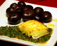 To serve, spoon some of the salsa verde on the plate and top with the halibut. I like to serve this with those pretty little purple potatoes that are rapidly becoming available -- it makes for a very colorful plate.