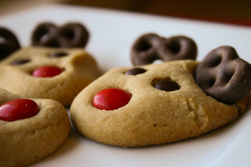 Form dough into 1-inch balls. To make reindeer-shaped cookies, pinch the bottom of the ball slightly to form a point, then gently flatten with your hand. Space cookies about 2 inches apart on a greased cookie sheet and bake for 7 to 8 minutes, until set or just beginning to brown.