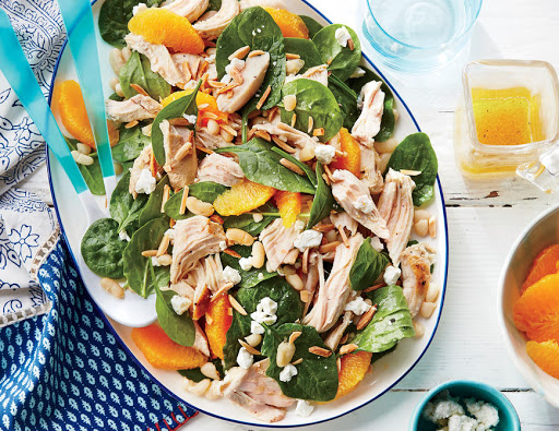 Squeeze juice from 1 orange to equal 1/4 cup. Peel remaining 2 oranges, and cut into segments. Whisk together orange juice, vinegar, shallots, and remaining 1/2 teaspoon salt and 1/4 teaspoon pepper in a large bowl. Add remaining 1/2 cup oil in a steady stream, whisking until incorporated. Add spinach, shredded chicken, beans, orange segments, almonds, and cheese, and toss with the dressing.