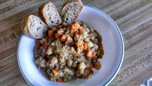 2. Add remaining vegetable broth, chickpeas, bulgur, and lentils in a soup pot. Bring to a boil, then simmer, partially covered, for 15 minutes.
