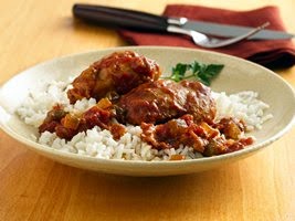 About 30 minutes before serving time, cook rice in water as directed on package. Serve chicken and sauce over rice.