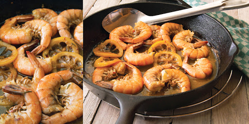 Flip the lemon slices and add rosemary, red pepper flakes, garlic, lemon juice, Worcestershire and hot sauce; bring a simmer. Season the shrimp with salt and pepper then add them to the skillet. They should sizzle as they hit the pan. Cook, stirring and turning often, until they are pink and firm to the touch, about 3 to 4 minutes total. Serve on a platter in a big, help yourself heap.