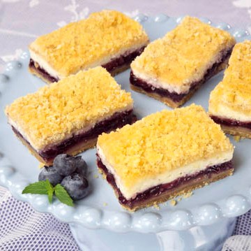 2.Spread blueberry filling evenly onto crust; top with the cream cheese mixture. Sprinkle with the reserved 1-1/2 cups crumb mixture.