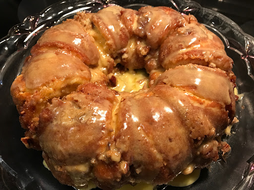 Bake at 350 degrees for 30 to 35 minutes. Invert onto serving plate and drizzle with orange frosting that came with biscuits.