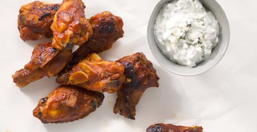 3.Preheat oven to 375°F. Line baking sheet with foil or parchment paper. Place cooling rack atop prepared baking sheet. Arrange drumettes on rack, spacing slightly apart. Spread any remaining marinade from dish over drumettes. Sprinkle with salt and pepper. Bake drumettes (still on cooling rack) until cooked through and brown in spots, about 45 minutes. Transfer drumettes to serving platter. Serve Blue Cheese Dipping Sauce alongside.