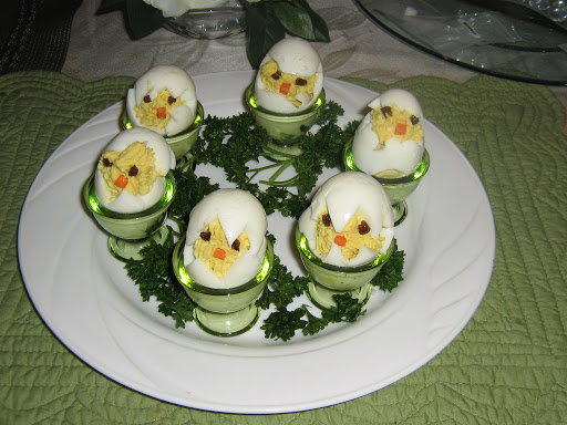 4. Fill bottom of egg with yolk mixture past white to form head. Place top back on.