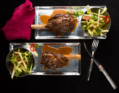 4. To a medium bowl, add the apples, red chile, parsley and salt. Squeeze the lemon half over the apples and gently toss to combine. Divide the lamb shanks among 4 plates. Serve with the reduced sauce and the spicy apples.
