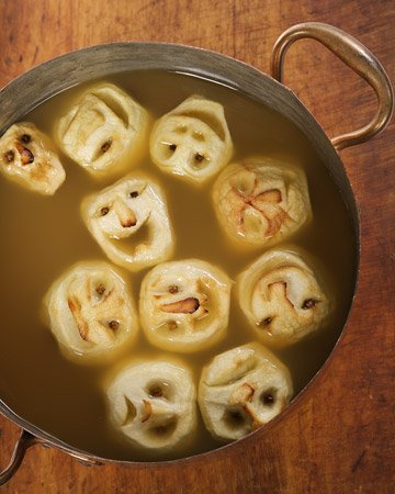 Peel apples and cut each in half through the stem; remove seeds and core. Using a sharp paring knife, carve a face, as desired, on the rounded side of each apple half. Place apples in lemon mixture for one minute; transfer to paper towels to drain.