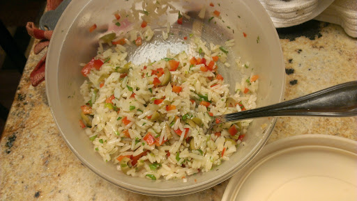 Combine rice, olives, onion, parsley, sweet red pepper, and tomato in a large bowl and toss gently.