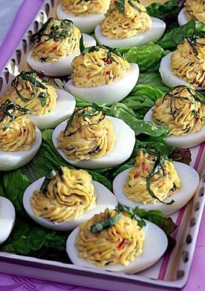 5. If the egg whites are inclined to roll around on a plate, cut a very thin slice off the bottom. Fill a pastry bag fitted with the star tip with the egg yolk mixture. Pipe the filling into the egg whites, then garnish the eggs with the remaining basil. If you don't have a pastry bag, you can cut the tip off a resealable bag to pipe in the filling, or use a teaspoon. Cover the eggs with plastic wrap and refrigerate until ready to serve.