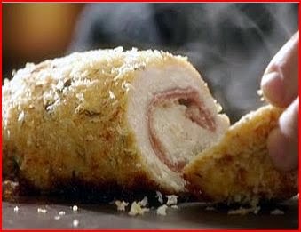Remove the plastic wrap. Lightly dust the chicken with flour, dip in the egg mixture and gently coat in the bread crumbs. Lightly coat a baking pan with olive oil and carefully transfer the roulades onto it. Bake for 20 to 25 minutes until browned and cooked through.