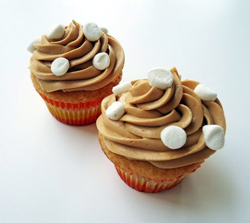 Take some mini marshmallows and cut each one half. Top the cupcakes with some of the marshmallows.