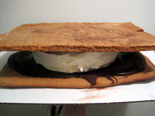 to look like a smore, cracker, chocolate, white cake (frosted) & topped w/cracker.