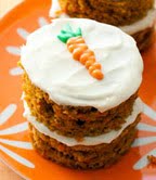 On half of the cake rounds, spread 1 Tbsp frosting each; top with remaining rounds. Frost each top with 1 1⁄2 Tbsp frosting. Place orange and green tinted frosting in separate quart-size ziptop bags. Snip off tip from each bag; pipe orange carrots and green tops on cakes.