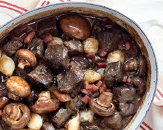 7. Cover and bake for 2 to 2½ hours or until meat is very tender. Uncover, remove garlic, thyme, bay leaf and parsley sprigs. Add reserved bacon, pearl onions and mushrooms, return pot to oven and bake another 15 minutes or until meat is very tender and sauce is rich.