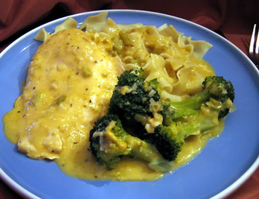 Remove chicken from slow cooker and shred (I left the chicken breasts whole.) Return chicken to slow cooker; add broth and cooked noodles. Mix well. Cover and cook on low setting for an additional 30 minutes or until heated through. Sometimes I just throw in some leftover vegetables at this point, if I have any - like peas and/or carrots. Sometimes I add a little thyme, because I like the flavor.