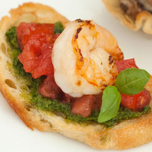 To assemble, spread each piece of toasted bread with 1⁄2 tsp pesto. Top with about 1⁄2 Tbsp tomato mixture, then one shrimp.