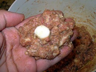 6. Plaze a mozzarella cube onto the patty and bring up the sides around the cheese and roll between hands to form a ball.