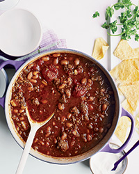 In a large enameled cast-iron casserole, heat the oil. Add half of the ground beef and brown over moderately high heat, about 2 minutes. Transfer the meat to a plate. Repeat with the remaining ground beef.