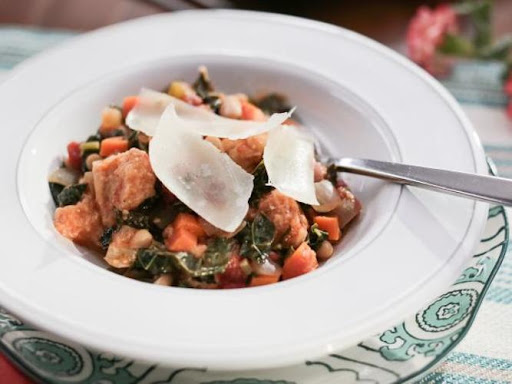 Add the kale and simmer, covered, until soft, another 15 minutes. Add the beans and bread and simmer until the bread starts to soften, 5 more minutes.