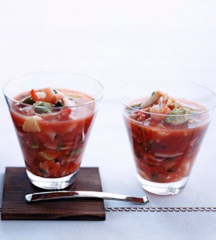 Stir together Clamato juice, ketchup, lime juice, hot sauce, salt, onion, and cilantro in a large bowl, then gently stir in avocado, crabmeat, and shrimp. Spoon into 6- or 8-ounce glasses or cups.
