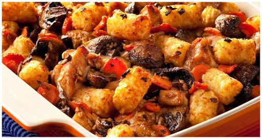 2..In a large bowl, whisk together oil and Soup Mix. Add Tater Tots®, chicken, mushrooms and carrots, and toss until well coated. Transfer to baking dish and spread evenly.