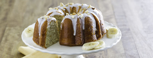 Stir together flour, 2 cups powdered sugar, 1/2 cup walnuts and baking powder in large bowl. Add oil, eggs, 1/2 cup sour cream, 2 mashed bananas and ginger. Beat with an electric mixer on low to medium speed about 1 minute until well combined. Pour batter into the greased and floured 10-inch bundt pan,