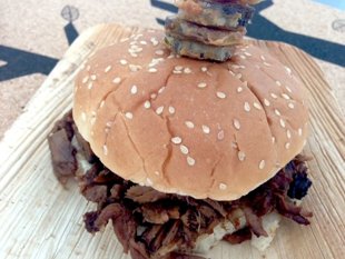 To assemble the sandwiches, simply add a scoop of pork on each bun, and top with four to five slices of fried pickle. Close the sandwich, and add another two to three fried pickles on top for presentation.