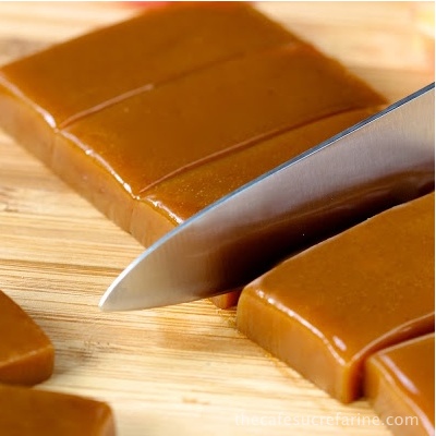 6. Cool completely at room temperature or refrigerate until set. Once set, remove caramel from pan lifting out by parchment paper or foil. Cut caramel into 3/4-inch squares or rectangles. Wrap each piece in small wax paper square, if desired, twisting at each end. Store caramels in airtight container in cool place or refrigerate up to 2 weeks.