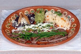 Para servir, coloca en el plato arroz, frijoles, enmoladas, guacamole y tampiqueñas