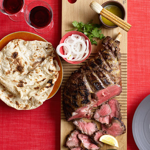 Light a charcoal grill. Remove the leg of lamb from the marinade, leaving on a thick layer. Move the hot coals to one side of the grill and place a drip pan opposite the coals. Set the lamb over the drip pan, cover the grill and cook until glazed and an instant-read thermometer registers 140° for medium, about 2 hours.