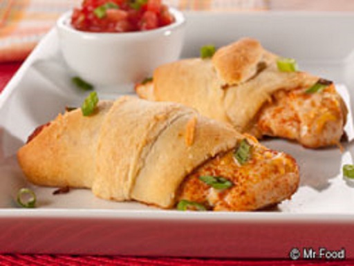 Separate dough into 8 triangles. Place 1 chicken tender on widest side of triangle; sprinkle with scallion and cheese. Roll dough around each chicken tender; place point side down on ungreased baking sheet.