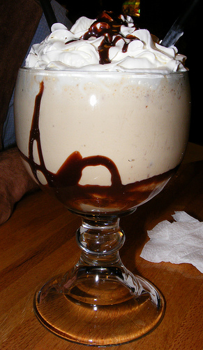 Chill parfait or martini glasses. While holding only the stems or bases of the glasses rim the inside of the glasses with chocolate syrup. Place a swirl of Ready Whip on top with a cherry and chocolate sprinkles and cinnamon for garnish.
