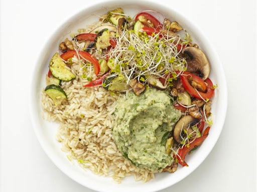 Heat the brown rice as the label directs. Divide among plates and top with the roasted vegetables, bean puree and sprouts.