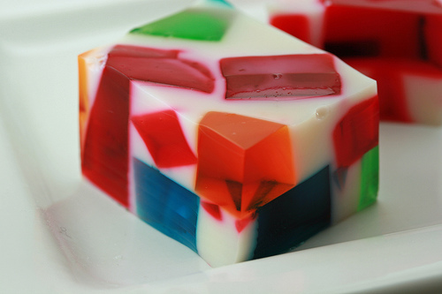 For each flavor, dissolve one 3 oz box of jello in one cup of boiling water. Pour into a container and chill (overnight is probably best, but I chilled it 3 hours until firm). After chilling the four flavors, cut them into small blocks.