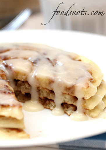 Cook the pancake 2 to 3 minutes, flip, cook an additional 2 to 3 minutes. When you flip the pancake onto a plate, you will see that the cinnamon filling has created a crater-swirl of cinnamon. Wipe out the pan with a paper towel, and repeat with the remaining pancake batter and cinnamon filling. Re-warm the glaze briefly, if needed. Serve pancakes topped with a drizzle of glaze.