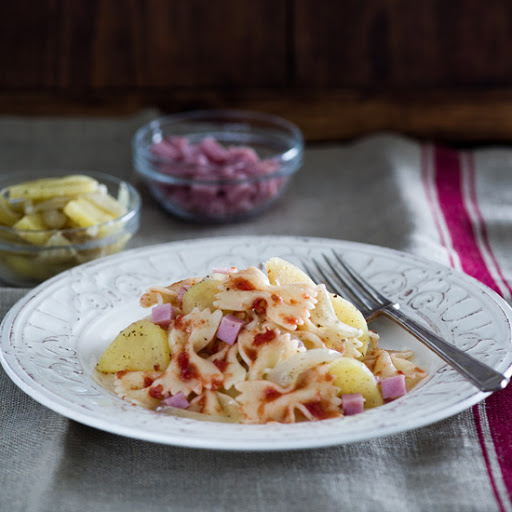 Bow-tie pasta with slices of sweet potato, diced Canadian bacon, and tomato puree form a harmonious dish of varied flavors, shapes, and colors.